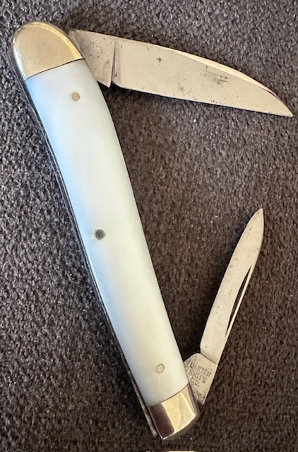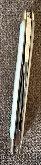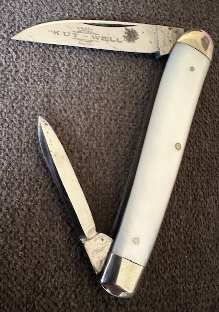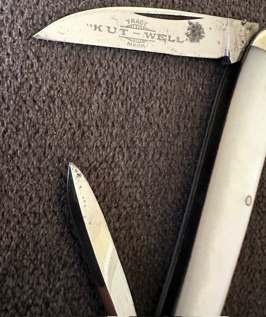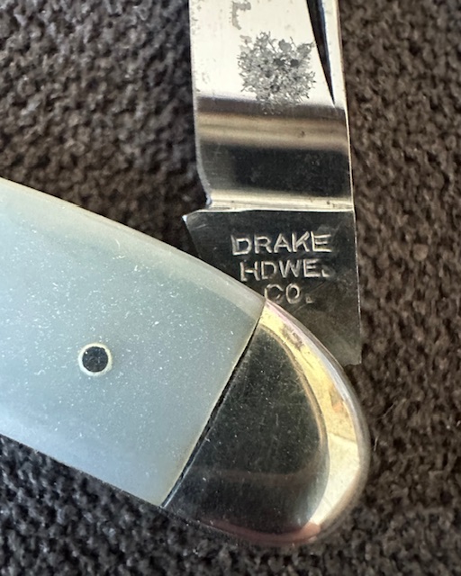 2 3/4″ Closed, Marked Drake HDWE Co on master, Ulster Knife co on Pen, etched “KUT WELL”, Drake Hdwe was located in Burlington Iowa c 1891-1941, Knife was made by Ulster Knife co for them, has some light scratches & a spider web type stain, good snap, no wobble, perfect mother of pearl, no cracks