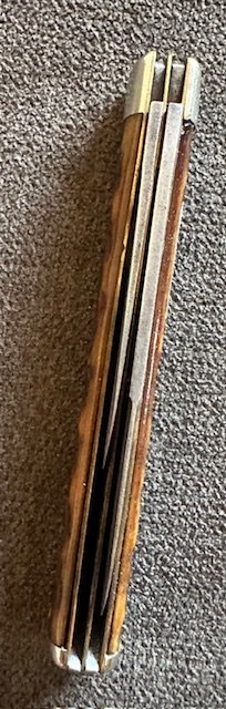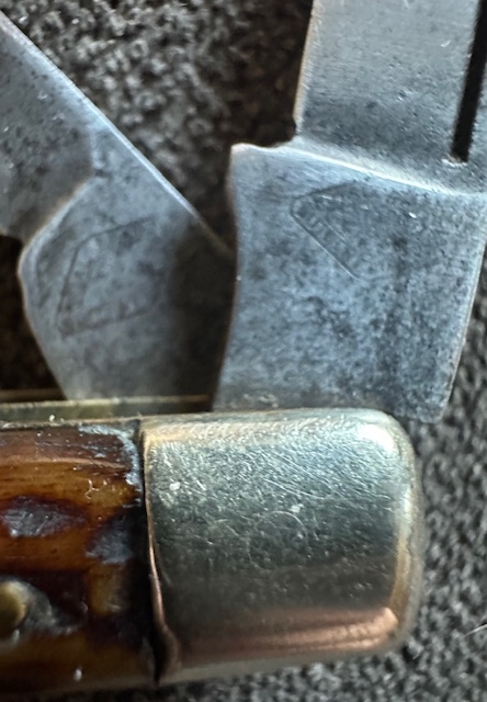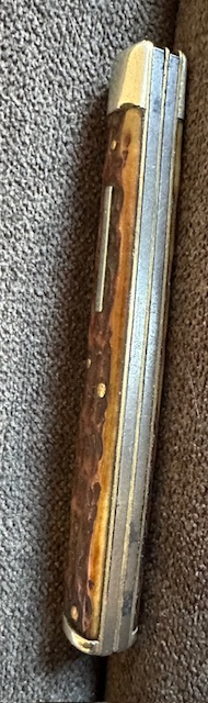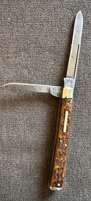 3 5/8″ Closed | Marked Royal Brand Cutlery Co, weak stamp,  Hard to read, has wear & light pitting, master bananas a little when open, good snap with half stops, has some wobble when open, nice jigged bone, no cracks