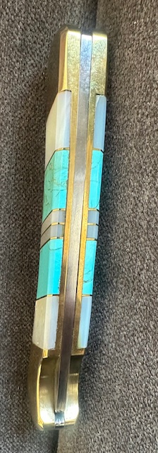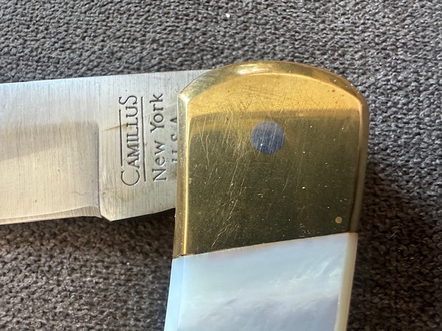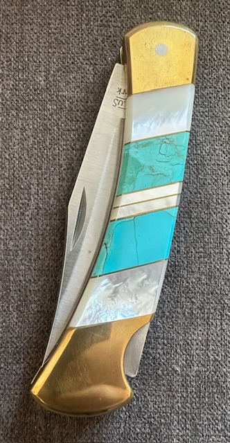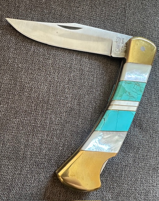 4 7/8″ Closed, Marked Camillus New York USA , Lock Back Knife customized by Santa Fe Knife Works, looks unused, has a few scratches